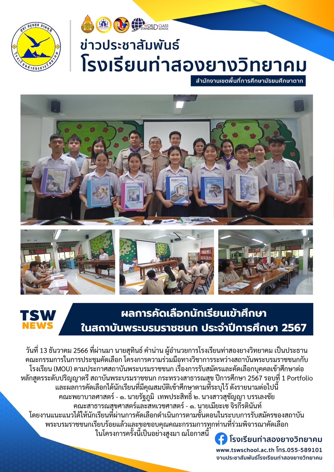 ผลการคัดเลือกนักเรียนเข้าศึกษาในสถานบันพระบรมราชชนก ประจำปีการศึกษา 2567 23 ธันวาคม 2566เทวัณ ดำดีข่าวสาร/กิจกรรม